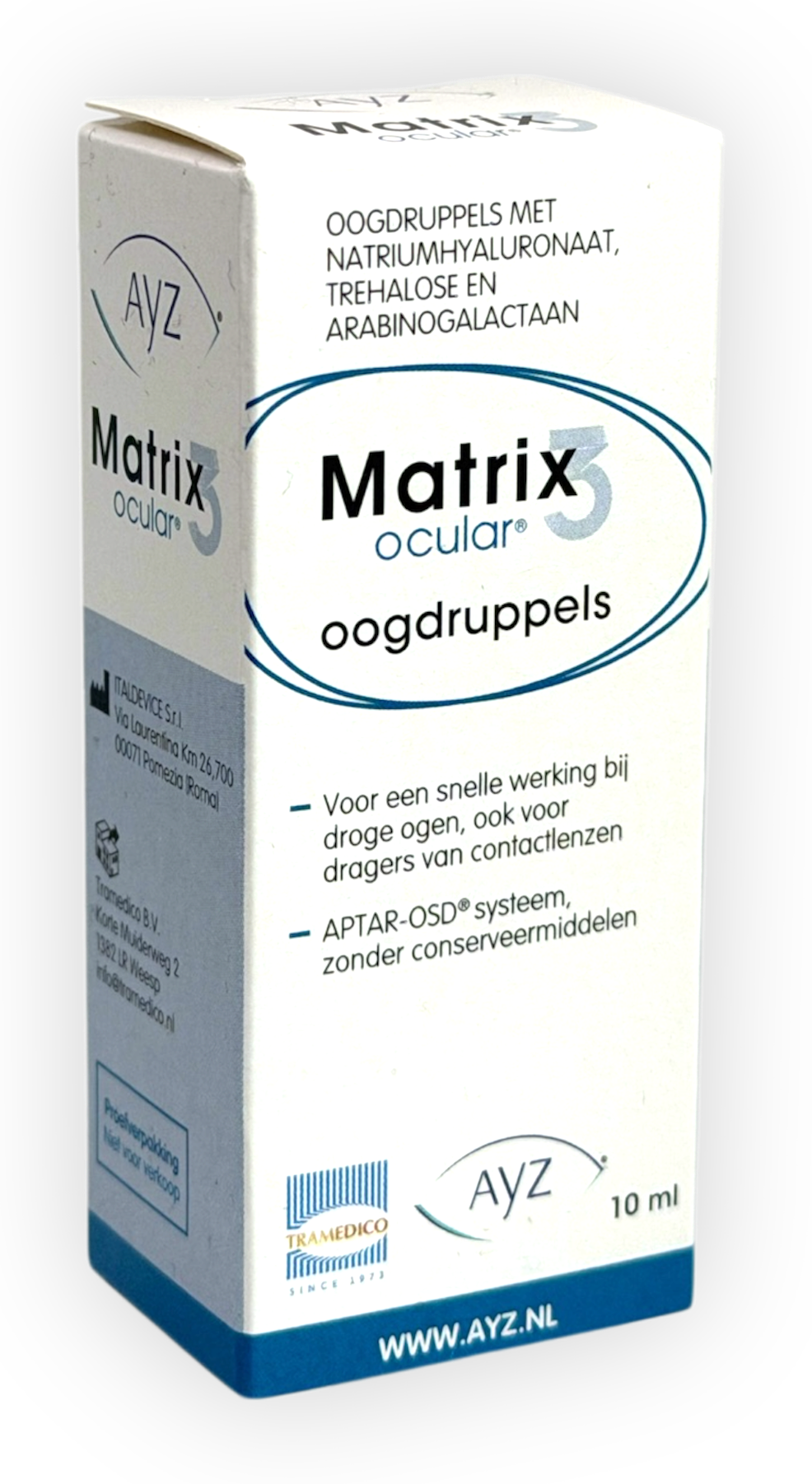 Moet jij je huidige oogdruppels (te) vaak per dag druppelen, kan AYZ Matrix3 geschikt voor jou zijn. De geavanceerde samenstelling met hyaluronzuur, trehalose én arabinogalactaan ondersteunt langdurig contact met het oogoppervlak en effectieve bevochtiging ervan.